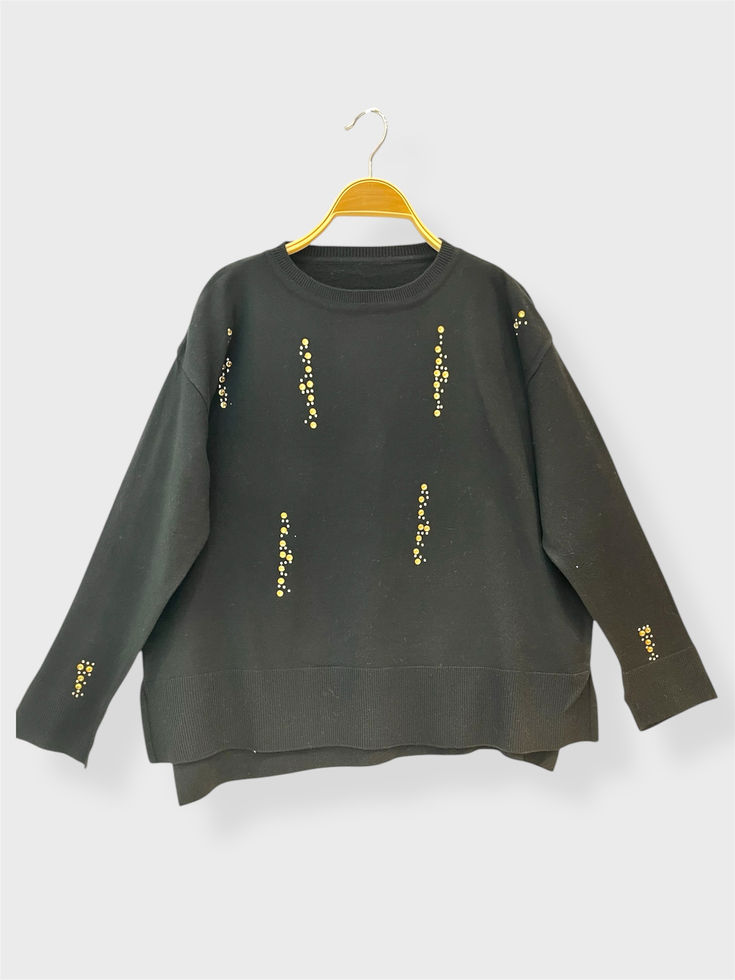 Sweter de bremer. Con detalle tipo morley en puños y ruedo, brillos a lo largo de su pecho y puños