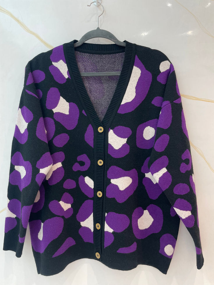 Cardigan channel de bremer doble hilo con estampado de manchas, escote V y botones. Oversize.