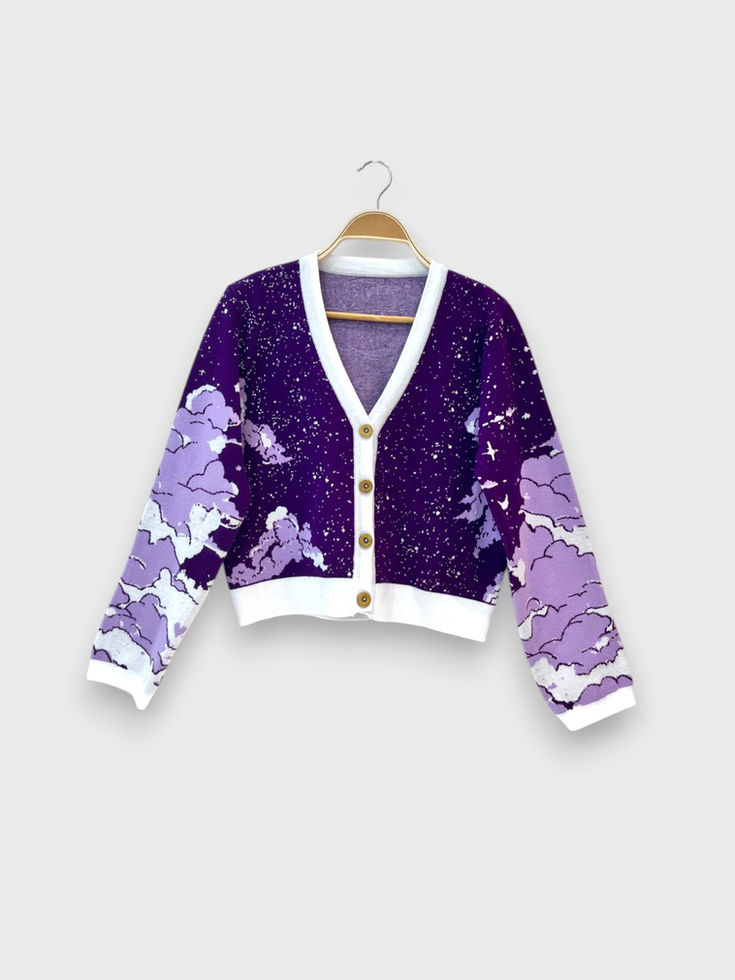Cardigan de bremer doble hilo. Con botones de madera y diseño de nubes y noche.