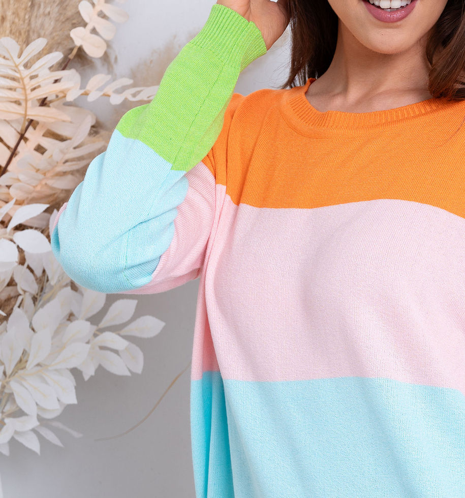 Sweater de lycra, con estampa de lineas de colores grandes.