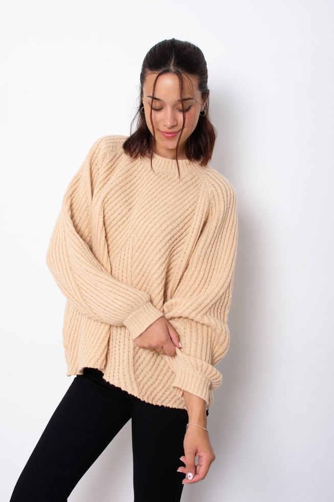 Sweater de hilo fancy. Con diseño tipo morley diagonal geometrico. Cuello redondo y mangas globo. Calce oversize.