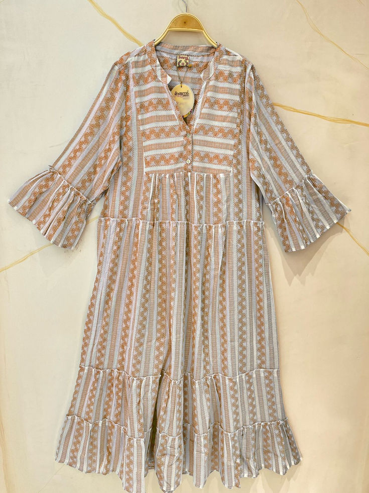 Túnica acampanada en capas con escote en V, cuello mao y cartera de botones. Tiene un hilado de color con lurex que forma los graficos tipo estampa tribal. De algodoón hecho en la India.