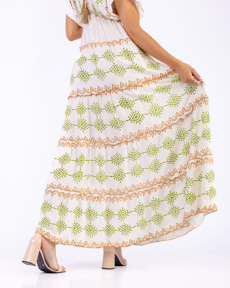 Vestido largo confeccionado en tejido liviano de algodón con caída fluida. Presenta escote en V con cordón trenzado para ajustar, terminado en borlas decorativas. Tiene manga corta amplia tipo murciélago y corte imperio con frunce bajo el busto que favorece el calce. La falda está compuesta por paños con recortes horizontales y estampado geométrico bordado en tonos verde y beige distribuidos en toda la prenda. Terminación inferior con leve ondulado. Prenda sin forro interno, de silueta amplia y cómoda. Importado de la India.