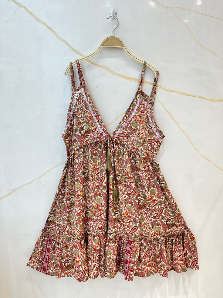 Vestido con en V en frente y espalda, con recortes a los laterales. Tiene una estampa única de la India, el cordón con borlas ajusta la cintura y tiene un decorado con lentejuelas en la zona top. Tiene un corte estilo talle bajo. De seda hecho en la India